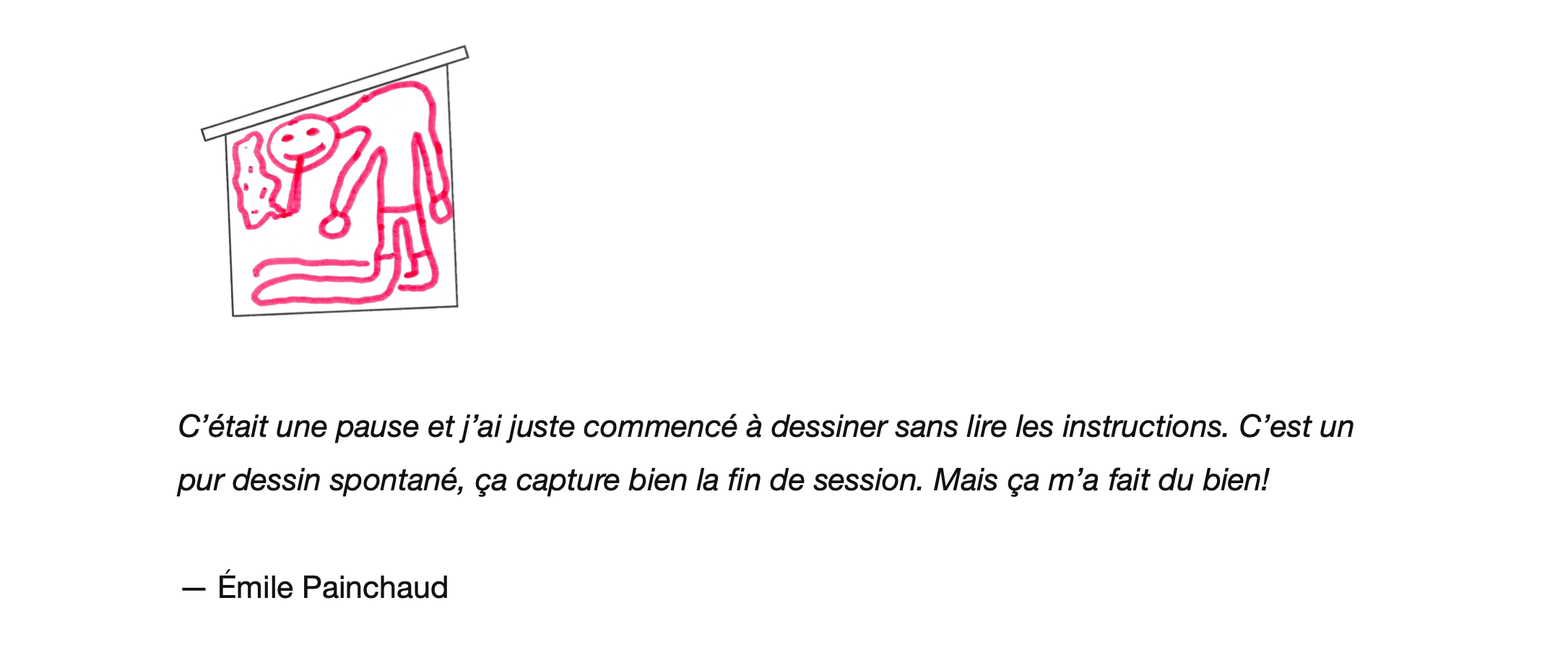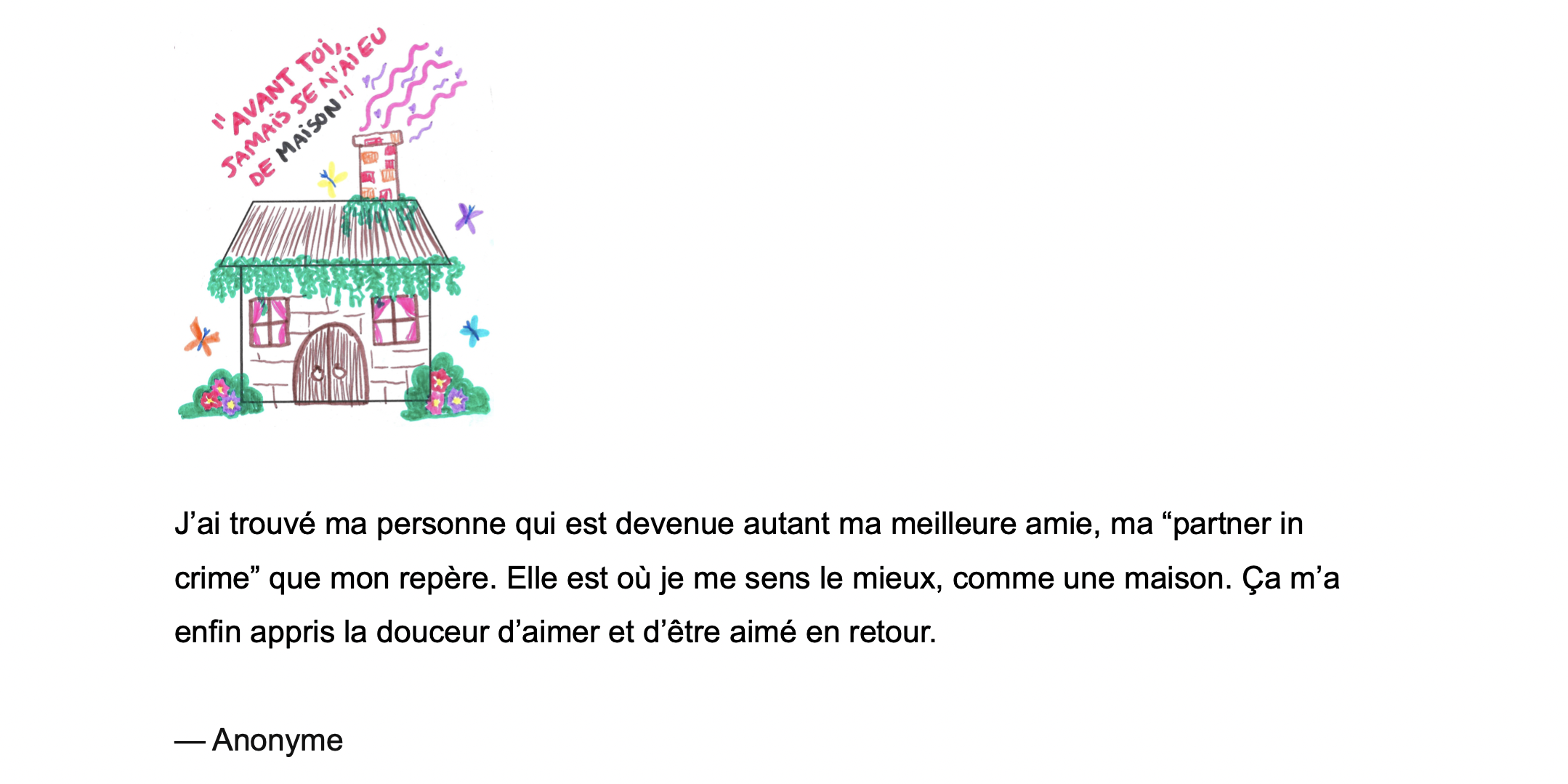 Comment feel ta maison? est un projet de coloriage collectif visant à prendre conscience de sa santé mentale, à réduire le stress et à se déconnecter des appareils électroniques. Comme un cahier à coloriage, les participant.es sont invité.es à illustrer leur état d’âme en remplissant de couleurs une maison d’une affiche. Suite à cette activité spontanée et de détente, les maisons des participants sont rassemblées dans un cahier à coloriage, passant alors d’une installation temporaire à un objet transportable qui perdure dans le temps.